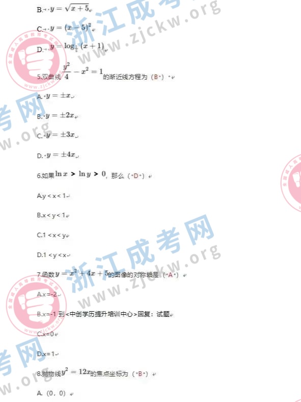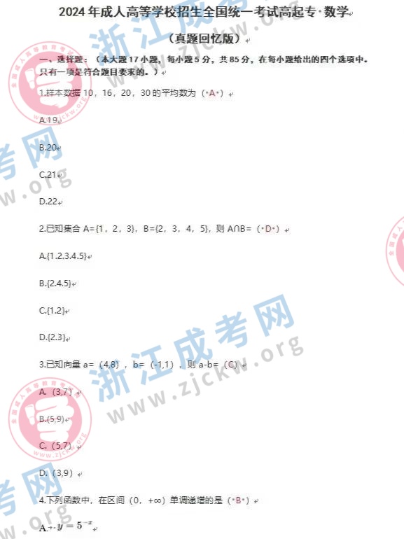 浙江成考網(wǎng)為廣大考生提供2024年成人高考全國統(tǒng)一考試(高起點數(shù)文)真題答案